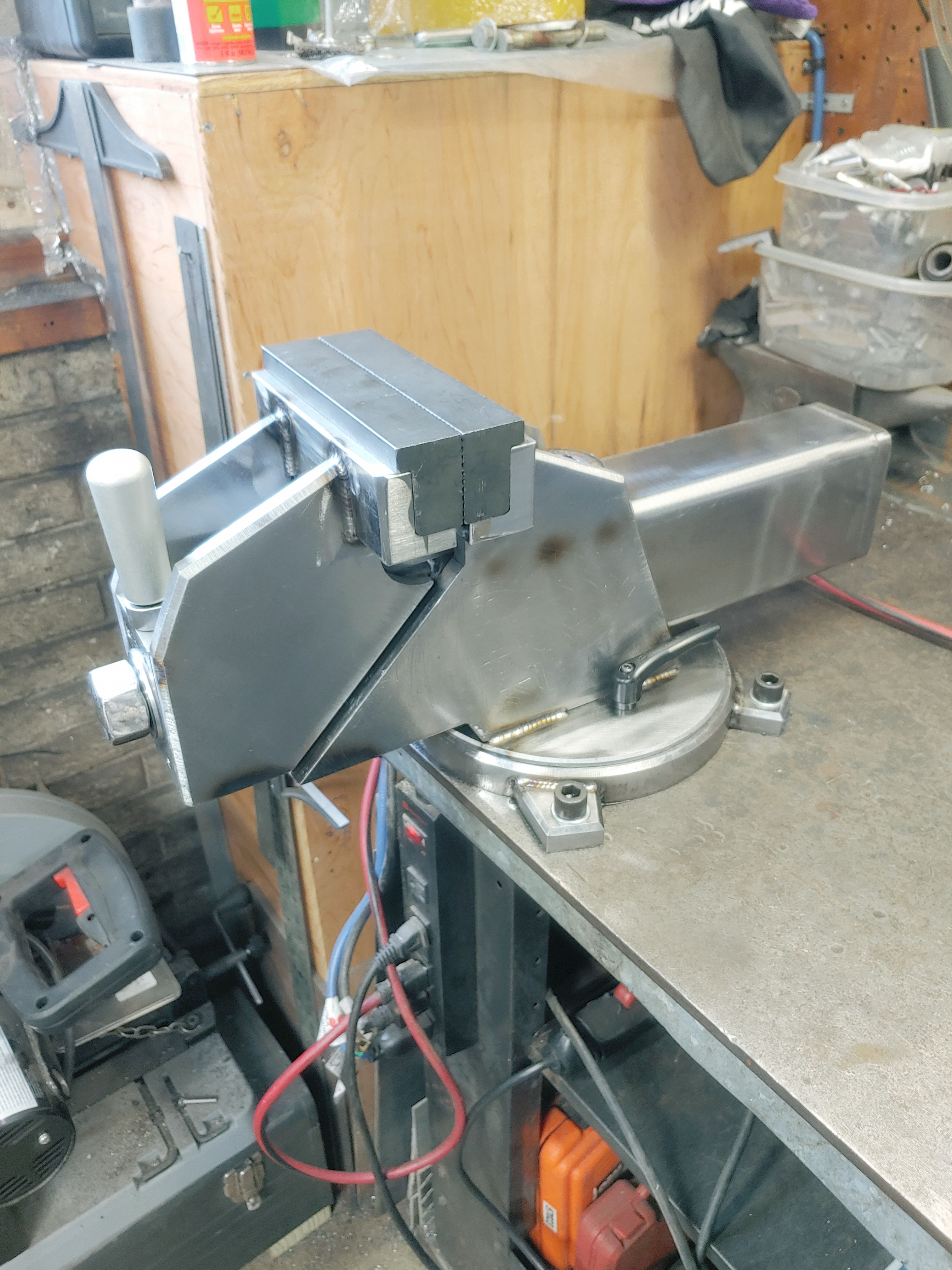 Here is my version of the Fireball DIY vise. 4x3 tube steel outer, 3.5x2.5 tube steel inner. 3/8” plate for sides. I did use the thrust bearing and needle bearing combo like the diy vise. I have a lather so I went with turned parts for the swivel base.